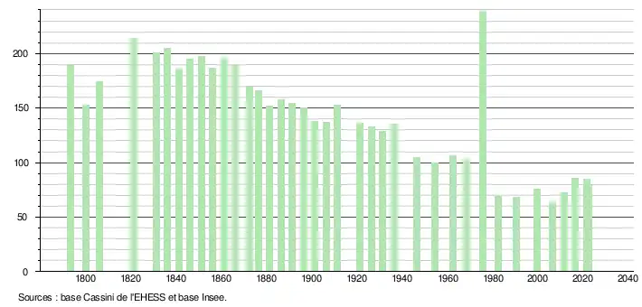 L'évolution du nombre d'habitants est connue à travers les recensements de la population effectués dans la commune depuis 1793. Pour les communes de moins de 10 000 habitants, une enquête de recensement portant sur toute la population est réalisée tous les cinq ans, les populations de référence des années intermédiaires étant quant à elles estimées par interpolation ou extrapolation[18]. Pour la commune, le premier recensement exhaustif entrant dans le cadre du nouveau dispositif a été réalisé en 2006[19].
