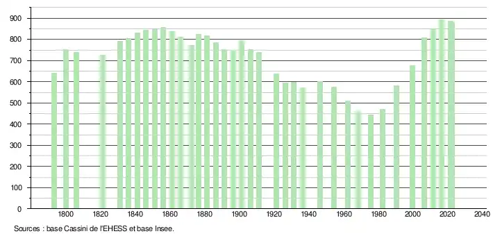 L'évolution du nombre d'habitants est connue à travers les recensements de la population effectués dans la commune depuis 1793. Pour les communes de moins de 10 000 habitants, une enquête de recensement portant sur toute la population est réalisée tous les cinq ans, les populations de référence des années intermédiaires étant quant à elles estimées par interpolation ou extrapolation[43]. Pour la commune, le premier recensement exhaustif entrant dans le cadre du nouveau dispositif a été réalisé en 2006[44].
