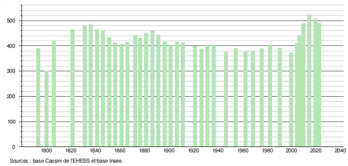 L'évolution du nombre d'habitants est connue à travers les recensements de la population effectués dans la commune depuis 1793. Pour les communes de moins de 10 000 habitants, une enquête de recensement portant sur toute la population est réalisée tous les cinq ans, les populations de référence des années intermédiaires étant quant à elles estimées par interpolation ou extrapolation[33]. Pour la commune, le premier recensement exhaustif entrant dans le cadre du nouveau dispositif a été réalisé en 2004[34].