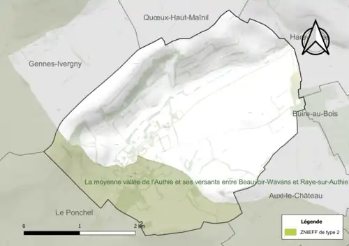 Le territoire communal comprend une ZNIEFF de type 2[Note 3] : la moyenne vallée de l'Authie et ses versants entre Beauvoir-Wavans et Raye-sur-Authie. Cette ZNIEFF de la moyenne vallée de l'Authie comprend une organisation paysagère régulière avec le fond de vallée humide, des versants calcaires, pentes boisées et hauteurs cultivées[12].
