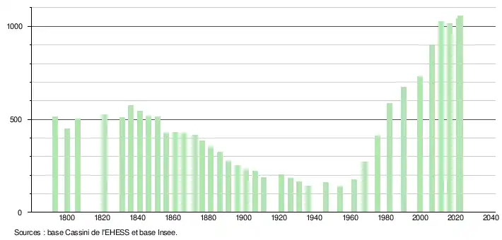 L'évolution du nombre d'habitants est connue à travers les recensements de la population effectués dans la commune depuis 1793. Pour les communes de moins de 10 000 habitants, une enquête de recensement portant sur toute la population est réalisée tous les cinq ans, les populations de référence des années intermédiaires étant quant à elles estimées par interpolation ou extrapolation[19]. Pour la commune, le premier recensement exhaustif entrant dans le cadre du nouveau dispositif a été réalisé en 2006[20].