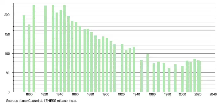 - ↑ Population municipale de référence en vigueur au 1er janvier 2025, millésimée 2022, définie dans les limites territoriales en vigueur au 1er janvier 2024, date de référence statistique : 1er janvier 2022.