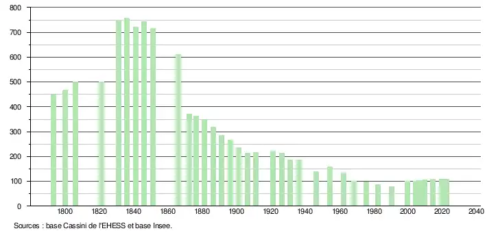 L'évolution du nombre d'habitants est connue à travers les recensements de la population effectués dans la commune depuis 1793. Pour les communes de moins de 10 000 habitants, une enquête de recensement portant sur toute la population est réalisée tous les cinq ans, les populations de référence des années intermédiaires étant quant à elles estimées par interpolation ou extrapolation[19]. Pour la commune, le premier recensement exhaustif entrant dans le cadre du nouveau dispositif a été réalisé en 2004[20].