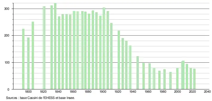 L'évolution du nombre d'habitants est connue à travers les recensements de la population effectués dans la commune depuis 1793. Pour les communes de moins de 10 000 habitants, une enquête de recensement portant sur toute la population est réalisée tous les cinq ans, les populations de référence des années intermédiaires étant quant à elles estimées par interpolation ou extrapolation[13]. Pour la commune, le premier recensement exhaustif entrant dans le cadre du nouveau dispositif a été réalisé en 2007[14].