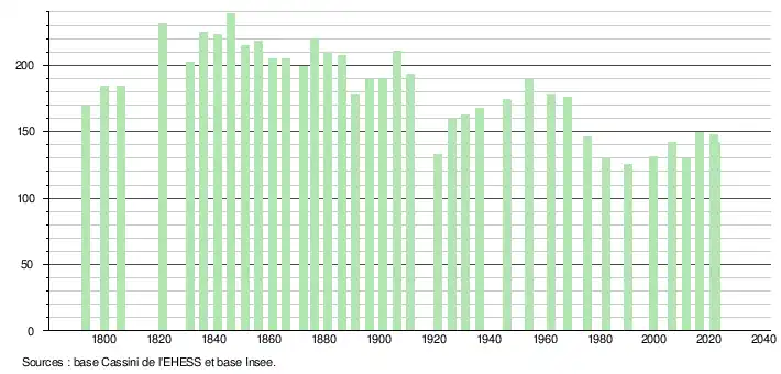 L'évolution du nombre d'habitants est connue à travers les recensements de la population effectués dans la commune depuis 1793. Pour les communes de moins de 10 000 habitants, une enquête de recensement portant sur toute la population est réalisée tous les cinq ans, les populations de référence des années intermédiaires étant quant à elles estimées par interpolation ou extrapolation[17]. Pour la commune, le premier recensement exhaustif entrant dans le cadre du nouveau dispositif a été réalisé en 2006[18].