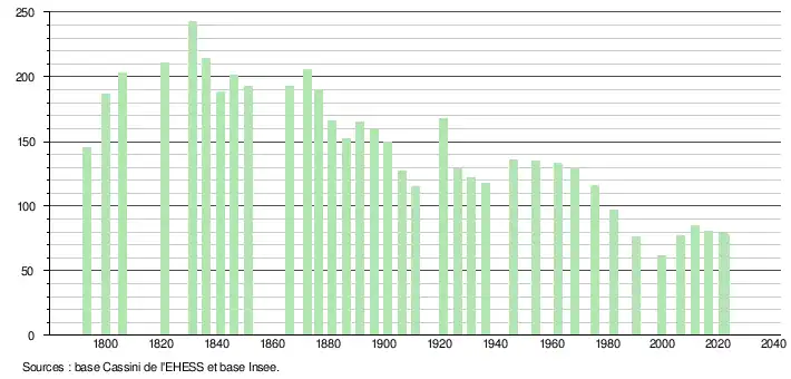 L'évolution du nombre d'habitants est connue à travers les recensements de la population effectués dans la commune depuis 1793. Pour les communes de moins de 10 000 habitants, une enquête de recensement portant sur toute la population est réalisée tous les cinq ans, les populations de référence des années intermédiaires étant quant à elles estimées par interpolation ou extrapolation[20]. Pour la commune, le premier recensement exhaustif entrant dans le cadre du nouveau dispositif a été réalisé en 2006[21].