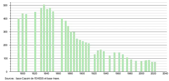 L'évolution du nombre d'habitants est connue à travers les recensements de la population effectués dans la commune depuis 1793. Pour les communes de moins de 10 000 habitants, une enquête de recensement portant sur toute la population est réalisée tous les cinq ans, les populations de référence des années intermédiaires étant quant à elles estimées par interpolation ou extrapolation[17]. Pour la commune, le premier recensement exhaustif entrant dans le cadre du nouveau dispositif a été réalisé en 2007[18].