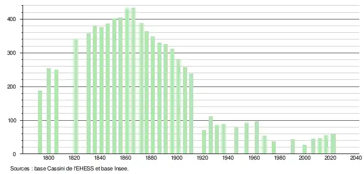 L'évolution du nombre d'habitants est connue à travers les recensements de la population effectués dans la commune depuis 1793. Pour les communes de moins de 10 000 habitants, une enquête de recensement portant sur toute la population est réalisée tous les cinq ans, les populations de référence des années intermédiaires étant quant à elles estimées par interpolation ou extrapolation[23]. Pour la commune, le premier recensement exhaustif entrant dans le cadre du nouveau dispositif a été réalisé en 2006[24].