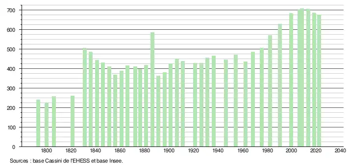 L'évolution du nombre d'habitants est connue à travers les recensements de la population effectués dans la commune depuis 1793. Pour les communes de moins de 10 000 habitants, une enquête de recensement portant sur toute la population est réalisée tous les cinq ans, les populations de référence des années intermédiaires étant quant à elles estimées par interpolation ou extrapolation[15]. Pour la commune, le premier recensement exhaustif entrant dans le cadre du nouveau dispositif a été réalisé en 2008[16].