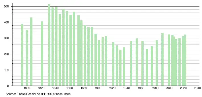 L'évolution du nombre d'habitants est connue à travers les recensements de la population effectués dans la commune depuis 1793. Pour les communes de moins de 10 000 habitants, une enquête de recensement portant sur toute la population est réalisée tous les cinq ans, les populations de référence des années intermédiaires étant quant à elles estimées par interpolation ou extrapolation[36]. Pour la commune, le premier recensement exhaustif entrant dans le cadre du nouveau dispositif a été réalisé en 2004[37].
