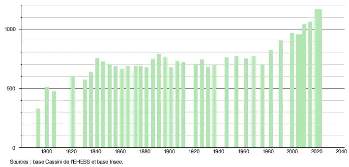 L'évolution du nombre d'habitants est connue à travers les recensements de la population effectués dans la commune depuis 1793. Pour les communes de moins de 10 000 habitants, une enquête de recensement portant sur toute la population est réalisée tous les cinq ans, les populations de référence des années intermédiaires étant quant à elles estimées par interpolation ou extrapolation[30]. Pour la commune, le premier recensement exhaustif entrant dans le cadre du nouveau dispositif a été réalisé en 2004[31].