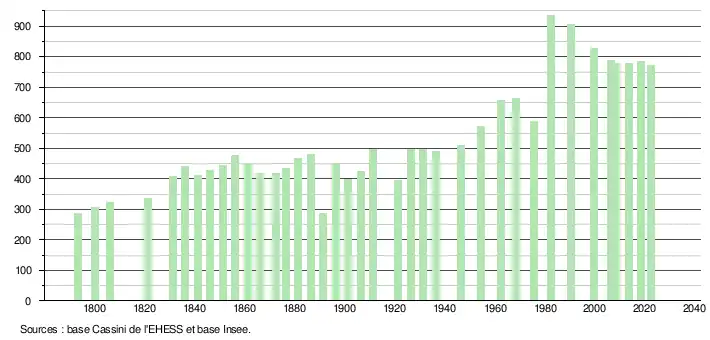 L'évolution du nombre d'habitants est connue à travers les recensements de la population effectués dans la commune depuis 1793. Pour les communes de moins de 10 000 habitants, une enquête de recensement portant sur toute la population est réalisée tous les cinq ans, les populations de référence des années intermédiaires étant quant à elles estimées par interpolation ou extrapolation[26]. Pour la commune, le premier recensement exhaustif entrant dans le cadre du nouveau dispositif a été réalisé en 2008[27].