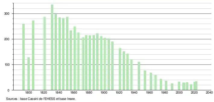 L'évolution du nombre d'habitants est connue à travers les recensements de la population effectués dans la commune depuis 1793. Pour les communes de moins de 10 000 habitants, une enquête de recensement portant sur toute la population est réalisée tous les cinq ans, les populations de référence des années intermédiaires étant quant à elles estimées par interpolation ou extrapolation[38]. Pour la commune, le premier recensement exhaustif entrant dans le cadre du nouveau dispositif a été réalisé en 2005[39].
