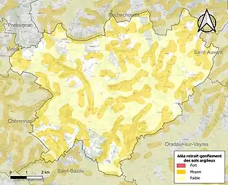 Le retrait-gonflement des sols argileux est susceptible d'engendrer des dommages importants aux bâtiments en cas d’alternance de périodes de sécheresse et de pluie[16]. 46,1 % de la superficie communale est en aléa moyen ou fort (27 % au niveau départemental et 48,5 % au niveau national métropolitain)[Carte 2]. Depuis le , en application de la loi ÉLAN, différentes contraintes s'imposent aux vendeurs, maîtres d'ouvrages ou constructeurs de biens situés dans une zone classée en aléa moyen ou fort[Note 1],[17].