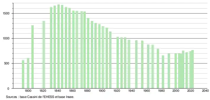 L'évolution du nombre d'habitants est connue à travers les recensements de la population effectués dans la commune depuis 1793. Pour les communes de moins de 10 000 habitants, une enquête de recensement portant sur toute la population est réalisée tous les cinq ans, les populations de référence des années intermédiaires étant quant à elles estimées par interpolation ou extrapolation[33]. Pour la commune, le premier recensement exhaustif entrant dans le cadre du nouveau dispositif a été réalisé en 2004[34].