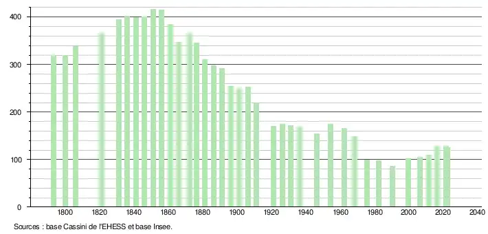 L'évolution du nombre d'habitants est connue à travers les recensements de la population effectués dans la commune depuis 1793. Pour les communes de moins de 10 000 habitants, une enquête de recensement portant sur toute la population est réalisée tous les cinq ans, les populations de référence des années intermédiaires étant quant à elles estimées par interpolation ou extrapolation[19]. Pour la commune, le premier recensement exhaustif entrant dans le cadre du nouveau dispositif a été réalisé en 2006[20].