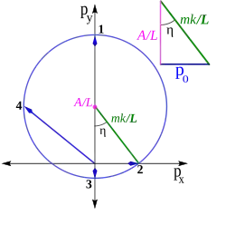 En d'autres termes, le vecteur quantité de mouvement p décrit un cercle de rayon mk/L centré en (0, A/L). L'excentricité e correspond au cosinus de l'angle η vu à la Figure 3. Il est également intéressant d'introduire la variable . Cet hodographe circulaire permet d'illustrer la symétrie du problème de Kepler.
