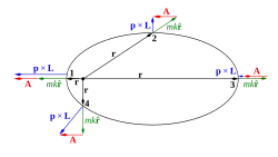 De plus la force étant centrale, le moment cinétique L est également constant et définit le plan dans lequel la particule se déplace. Le vecteur de Runge-Lenz est perpendiculaire à L car p ∧ L et r sont perpendiculaires à L. Il s'ensuit que A est contenu dans le plan de l'orbite.