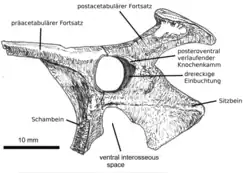 Plusieurs caractéristiques uniques, autapomorphiques, ont été établies. L'articulation de la hanche est délimitée sur son coin supérieur arrière par un creux triangulaire. Ce creux est surplombé par une crête s'étendant vers le bas à l'arrière. L'arête avant de l'ilium possède également un creux à peu près ovale[3].