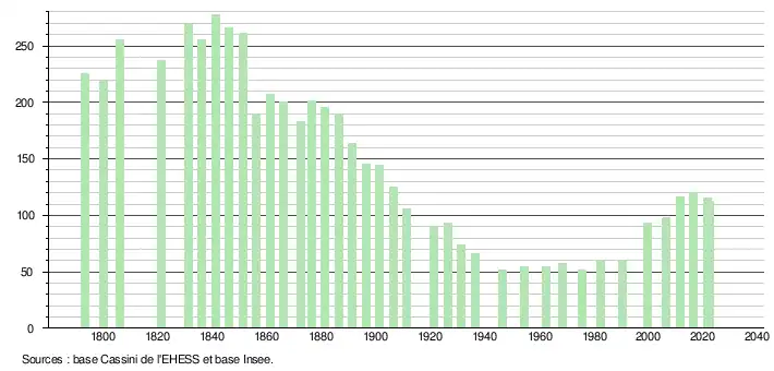 L'évolution du nombre d'habitants est connue à travers les recensements de la population effectués dans la commune depuis 1793. Pour les communes de moins de 10 000 habitants, une enquête de recensement portant sur toute la population est réalisée tous les cinq ans, les populations de référence des années intermédiaires étant quant à elles estimées par interpolation ou extrapolation[15]. Pour la commune, le premier recensement exhaustif entrant dans le cadre du nouveau dispositif a été réalisé en 2006[16].