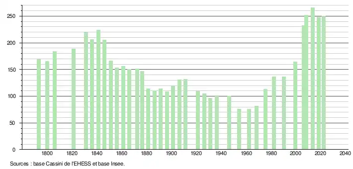 L'évolution du nombre d'habitants est connue à travers les recensements de la population effectués dans la commune depuis 1793. Pour les communes de moins de 10 000 habitants, une enquête de recensement portant sur toute la population est réalisée tous les cinq ans, les populations de référence des années intermédiaires étant quant à elles estimées par interpolation ou extrapolation[16]. Pour la commune, le premier recensement exhaustif entrant dans le cadre du nouveau dispositif a été réalisé en 2008[17].
