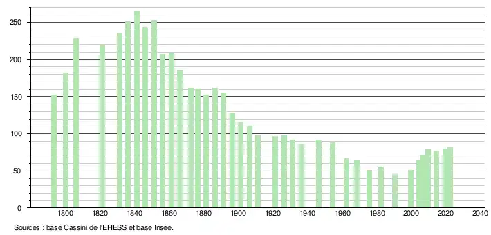 L'évolution du nombre d'habitants est connue à travers les recensements de la population effectués dans la commune depuis 1793. Pour les communes de moins de 10 000 habitants, une enquête de recensement portant sur toute la population est réalisée tous les cinq ans, les populations de référence des années intermédiaires étant quant à elles estimées par interpolation ou extrapolation[16]. Pour la commune, le premier recensement exhaustif entrant dans le cadre du nouveau dispositif a été réalisé en 2004[17].