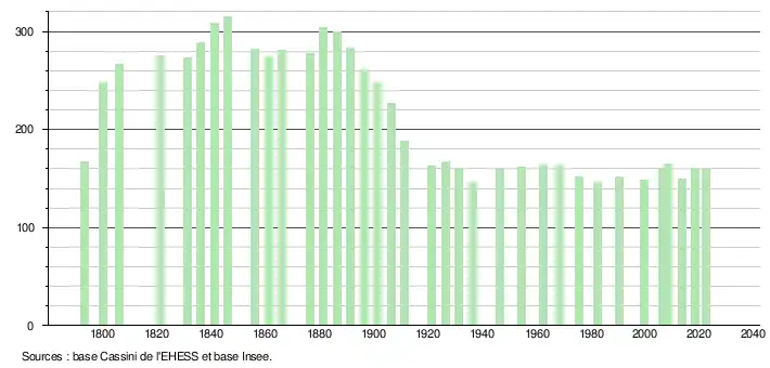 L'évolution du nombre d'habitants est connue à travers les recensements de la population effectués dans la commune depuis 1793. Pour les communes de moins de 10 000 habitants, une enquête de recensement portant sur toute la population est réalisée tous les cinq ans, les populations de référence des années intermédiaires étant quant à elles estimées par interpolation ou extrapolation[36]. Pour la commune, le premier recensement exhaustif entrant dans le cadre du nouveau dispositif a été réalisé en 2008[37].