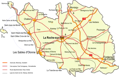 - ↑ Nathalie Houdayer, « Plus de 30 ans après, la liaison rapide entre Challans et La Roche-sur-Yon sur le point d’être finie », sur ouest-france.fr, Ouest-France, (consulté le ).