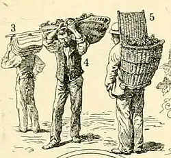 Les vendangeurs coupent le raisin et le déposent dans le vendangerot. Ils le transportent à la main de cep en cep. Le vendangerot sera déversé dans une hotte, un grand panier, ou une benne, que le porteur sortira de la parcelle de vigne.