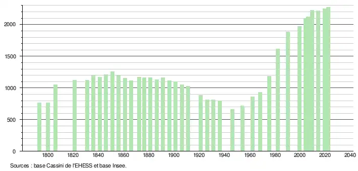 L'évolution du nombre d'habitants est connue à travers les recensements de la population effectués dans la commune depuis 1793. Pour les communes de moins de 10 000 habitants, une enquête de recensement portant sur toute la population est réalisée tous les cinq ans, les populations de référence des années intermédiaires étant quant à elles estimées par interpolation ou extrapolation[32]. Pour la commune, le premier recensement exhaustif entrant dans le cadre du nouveau dispositif a été réalisé en 2004[33].