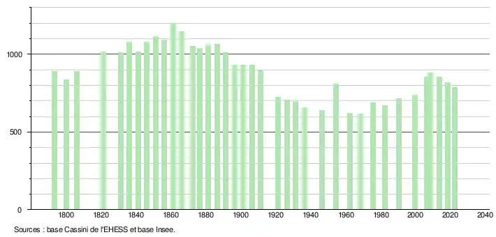 L'évolution du nombre d'habitants est connue à travers les recensements de la population effectués dans la commune depuis 1793. Pour les communes de moins de 10 000 habitants, une enquête de recensement portant sur toute la population est réalisée tous les cinq ans, les populations de référence des années intermédiaires étant quant à elles estimées par interpolation ou extrapolation[25]. Pour la commune, le premier recensement exhaustif entrant dans le cadre du nouveau dispositif a été réalisé en 2008[26].