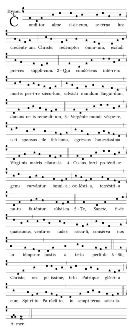 Or, il est vraisemblable qu'il existait des paraphrases de ces antiennes, avant la création de Veni, veni Emmanuel. Ainsi, quelques paraphrases de celles-ci en allemand se trouvent dans le Groẞ Catholisch Gesangbuch de Dom David Gregor Corner, publié en 1631, et repris dans les Katholische Kirchenlieder, Hymnen, Psalmen aus den ältesten deutschen gedruckten Gesang und Gebetbüchern[vl 1] (1859) [2]. En général, ces textes étaient chantés avec la mélodie de l'hymne Conditor alme siderum[vl 1]. Cette dernière est exécutée à l'Avent, plus précisément lors des vêpres comme de grandes antiennes. En effet, il y avait une tendance qui remplaçait d'anciens chants sans refrain par de nouvelles compositions en refrain. L'un des cas les plus connus est l'hymne Puer natus in Bethlehem en refrain au lieu de l'introït Puer natus est nobis sans refrain.