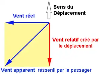 Le vent apparent est la somme vectorielle du vent réel et du vent généré par le déplacement du véhicule (que l'on qualifie de vent vitesse ou de vent relatif). Le vent relatif associé à un véhicule en déplacement a une vitesse égale à la vitesse de déplacement du véhicule et un sens opposé à celui suivi par le véhicule.