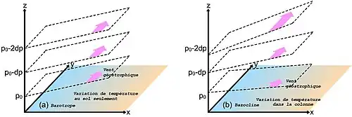 Selon la définition ci-dessus, une masse d'air où la variation de température avec l'altitude est la même partout n'aura aucun vent thermique. Le vent sera le même à toutes les altitudes, c'est ce qu'on appelle une masse d'air barotrope. Par contre, lorsqu'il y a une variation de la température moyenne quand on se déplace selon x ou y, cela implique que le vent variera avec l'altitude et c'est alors une atmosphère barocline[5].