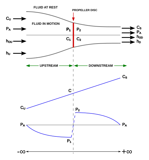 Pour satisfaire la contrainte de continuité à travers le disque d'hélice, les vitesses C1 et C2 doivent être égales (C1 = C2 = C), évitant ainsi une onde de choc. En revanche, une différence de pression totale (dynamique et stagnante) est générée à travers le disque[1].