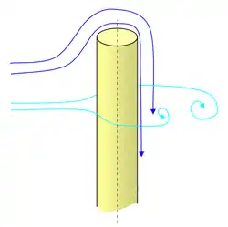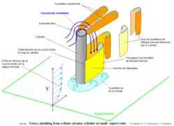 Une telle diminution n'est pas surprenante en mécanique des fluides[réf. nécessaire] puisque le des corps suscitant un écoulement 3D est toujours beaucoup plus faible que le des corps suscitant un écoulement 2D, ceci parce qu'un corps suscitant un écoulement 3D offre toujours plus de voies à son contournement par le fluide qu'un corps suscitant un écoulement 2D[n 2] : le d'un cylindre court est donc plus faible que celui du cylindre infini[réf. nécessaire].