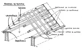 Une panne ventrière est une panne située entre la tête de versant de la charpente (panne faitière et le pied du versant (panne sablière).