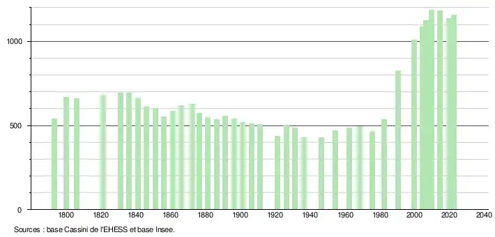 L'évolution du nombre d'habitants est connue à travers les recensements de la population effectués dans la commune depuis 1793. Pour les communes de moins de 10 000 habitants, une enquête de recensement portant sur toute la population est réalisée tous les cinq ans, les populations de référence des années intermédiaires étant quant à elles estimées par interpolation ou extrapolation[31]. Pour la commune, le premier recensement exhaustif entrant dans le cadre du nouveau dispositif a été réalisé en 2004[32].