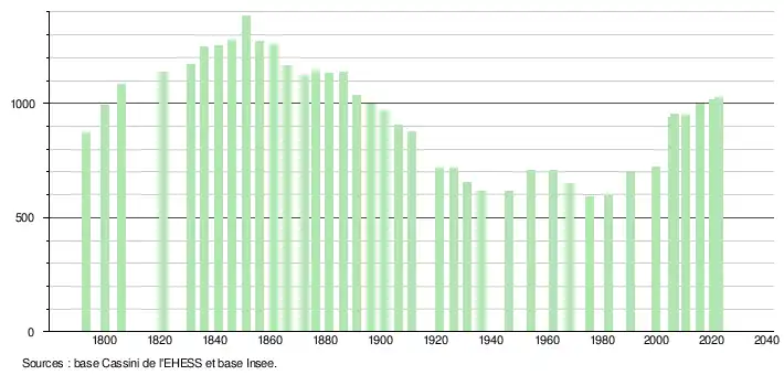 | L'évolution du nombre d'habitants est connue à travers les recensements de la population effectués dans la commune depuis 1793. Pour les communes de moins de 10 000 habitants, une enquête de recensement portant sur toute la population est réalisée tous les cinq ans, les populations de référence des années intermédiaires étant quant à elles estimées par interpolation ou extrapolation[34]. Pour la commune, le premier recensement exhaustif entrant dans le cadre du nouveau dispositif a été réalisé en 2005[35]. En 2022, la commune comptait 1 026 habitants[Note 6], en évolution de +3,43 % par rapport à 2016 (Tarn : +2,52 %, France hors Mayotte : +2,11 %). |
