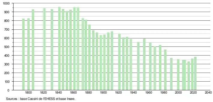 L'évolution du nombre d'habitants est connue à travers les recensements de la population effectués dans la commune depuis 1793. Pour les communes de moins de 10 000 habitants, une enquête de recensement portant sur toute la population est réalisée tous les cinq ans, les populations de référence des années intermédiaires étant quant à elles estimées par interpolation ou extrapolation[27]. Pour la commune, le premier recensement exhaustif entrant dans le cadre du nouveau dispositif a été réalisé en 2008[28].