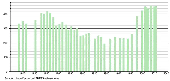 L'évolution du nombre d'habitants est connue à travers les recensements de la population effectués dans la commune depuis 1793. Pour les communes de moins de 10 000 habitants, une enquête de recensement portant sur toute la population est réalisée tous les cinq ans, les populations de référence des années intermédiaires étant quant à elles estimées par interpolation ou extrapolation[20]. Pour la commune, le premier recensement exhaustif entrant dans le cadre du nouveau dispositif a été réalisé en 2004[21].