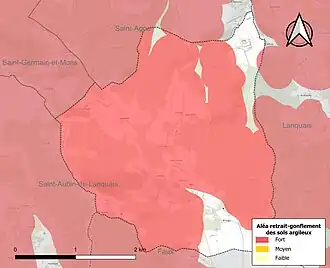 Les mouvements de terrains susceptibles de se produire sur la commune sont des tassements différentiels[36]. Le retrait-gonflement des sols argileux est susceptible d'engendrer des dommages importants aux bâtiments en cas d’alternance de périodes de sécheresse et de pluie[37]. 87,7 % de la superficie communale est en aléa moyen ou fort (58,6 % au niveau départemental et 48,5 % au niveau national métropolitain)[Carte 4]. Depuis le , en application de la loi ÉLAN, différentes contraintes s'imposent aux vendeurs, maîtres d'ouvrages ou constructeurs de biens situés dans une zone classée en aléa moyen ou fort[Note 4],[38].