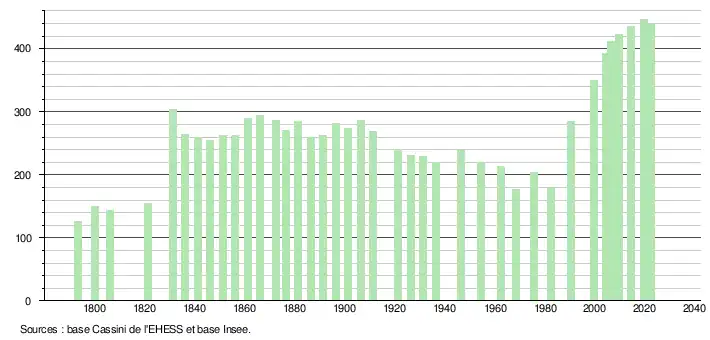 L'évolution du nombre d'habitants est connue à travers les recensements de la population effectués dans la commune depuis 1793. Pour les communes de moins de 10 000 habitants, une enquête de recensement portant sur toute la population est réalisée tous les cinq ans, les populations de référence des années intermédiaires étant quant à elles estimées par interpolation ou extrapolation[29]. Pour la commune, le premier recensement exhaustif entrant dans le cadre du nouveau dispositif a été réalisé en 2004[30].