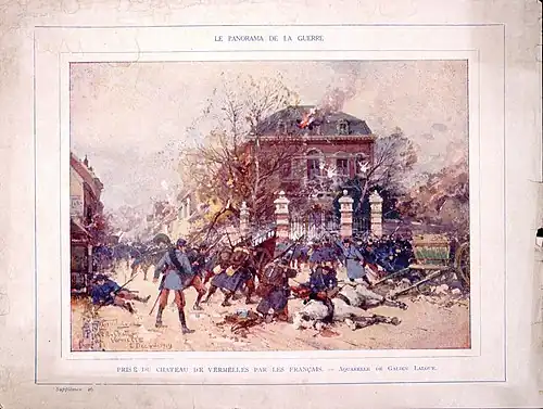 Lors de la Première Guerre mondiale, les tranchées s’installent au cœur du village. Vermelles subit la présence du front de guerre à l’ouest du village et se voit détruite au fil de la bataille du 14 octobre 1914 au 7 décembre 1914[27]. Cette bataille menée par la 58e Division d’Infanterie ne laisse aucune chance au village, celui-ci n’est plus qu’un amas de débris. Dans l’année suivant cette bataille, un ouvrage intitulé Vermelles, sur le front de Maurice Beslay paraît en 1915 et détaille la vie dans les tranchées situées dans la commune et l’état du village en seulement quelques semaines de guerre[28]. Aujourd’hui, la commune comprend plusieurs cimetières militaires britanniques du Commonwealth afin de rendre hommage aux soldats britanniques ayant combattu et perdus la vie dans les tranchées vermelloises[29],[30].