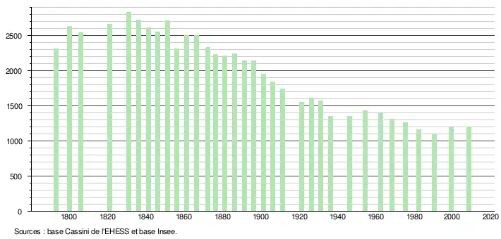 L'évolution du nombre d'habitants est connue à travers les recensements de la population effectués dans la commune depuis 1793. À partir du , les populations légales des communes sont publiées annuellement dans le cadre d'un recensement qui repose désormais sur une collecte d'information annuelle, concernant successivement tous les territoires communaux au cours d'une période de cinq ans. Pour les communes de moins de 10 000 habitants, une enquête de recensement portant sur toute la population est réalisée tous les cinq ans, les populations légales des années intermédiaires étant quant à elles estimées par interpolation ou extrapolation[8]. Pour la commune, le premier recensement exhaustif entrant dans le cadre du nouveau dispositif a été réalisé en 2008[9],[Note 1].