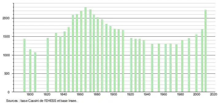 L'évolution du nombre d'habitants est connue à travers les recensements de la population effectués dans la commune depuis 1793. À partir du , les populations légales des communes sont publiées annuellement dans le cadre d'un recensement qui repose désormais sur une collecte d'information annuelle, concernant successivement tous les territoires communaux au cours d'une période de cinq ans. Pour les communes de moins de 10 000 habitants, une enquête de recensement portant sur toute la population est réalisée tous les cinq ans, les populations légales des années intermédiaires étant quant à elles estimées par interpolation ou extrapolation[10]. Pour la commune, le premier recensement exhaustif entrant dans le cadre du nouveau dispositif a été réalisé en 2005[11],[Note 1].