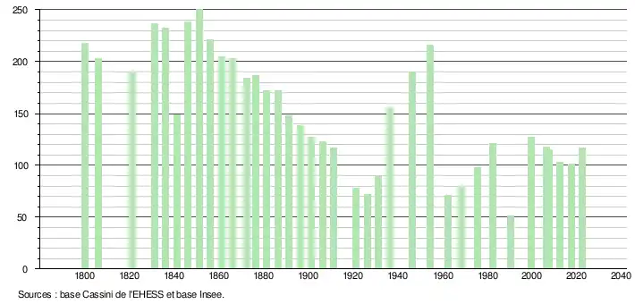 L'évolution du nombre d'habitants est connue à travers les recensements de la population effectués dans la commune depuis 1800. Pour les communes de moins de 10 000 habitants, une enquête de recensement portant sur toute la population est réalisée tous les cinq ans, les populations de référence des années intermédiaires étant quant à elles estimées par interpolation ou extrapolation[15]. Pour la commune, le premier recensement exhaustif entrant dans le cadre du nouveau dispositif a été réalisé en 2007[16].