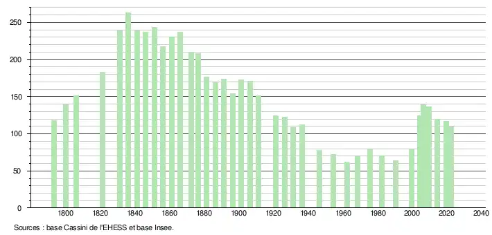 L'évolution du nombre d'habitants est connue à travers les recensements de la population effectués dans la commune depuis 1793. Pour les communes de moins de 10 000 habitants, une enquête de recensement portant sur toute la population est réalisée tous les cinq ans, les populations de référence des années intermédiaires étant quant à elles estimées par interpolation ou extrapolation[17]. Pour la commune, le premier recensement exhaustif entrant dans le cadre du nouveau dispositif a été réalisé en 2004[18].
