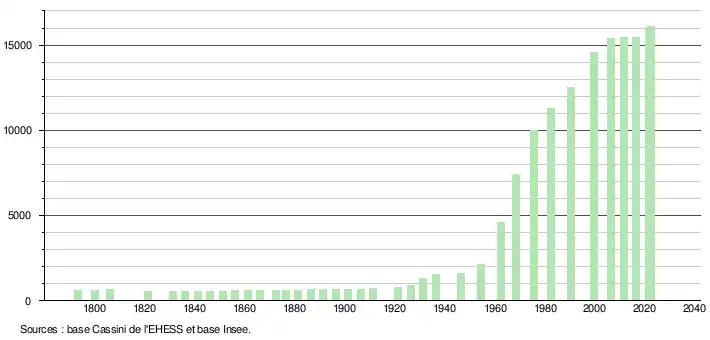 - ↑ Par convention dans Wikipédia, le principe a été retenu de n’afficher dans le tableau des recensements et le graphique, pour les populations de référence postérieures à 1999, que les populations correspondant à une enquête exhaustive de recensement pour les communes de moins de 10 000 habitants, et que les populations des années 2006, 2011, 2016, etc. pour les communes de plus de 10 000 habitants, ainsi que la dernière population de référence publiée par l’Insee pour l'ensemble des communes.