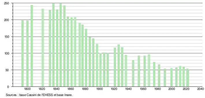 L'évolution du nombre d'habitants est connue à travers les recensements de la population effectués dans la commune depuis 1793. Pour les communes de moins de 10 000 habitants, une enquête de recensement portant sur toute la population est réalisée tous les cinq ans, les populations de référence des années intermédiaires étant quant à elles estimées par interpolation ou extrapolation[16]. Pour la commune, le premier recensement exhaustif entrant dans le cadre du nouveau dispositif a été réalisé en 2006[17].